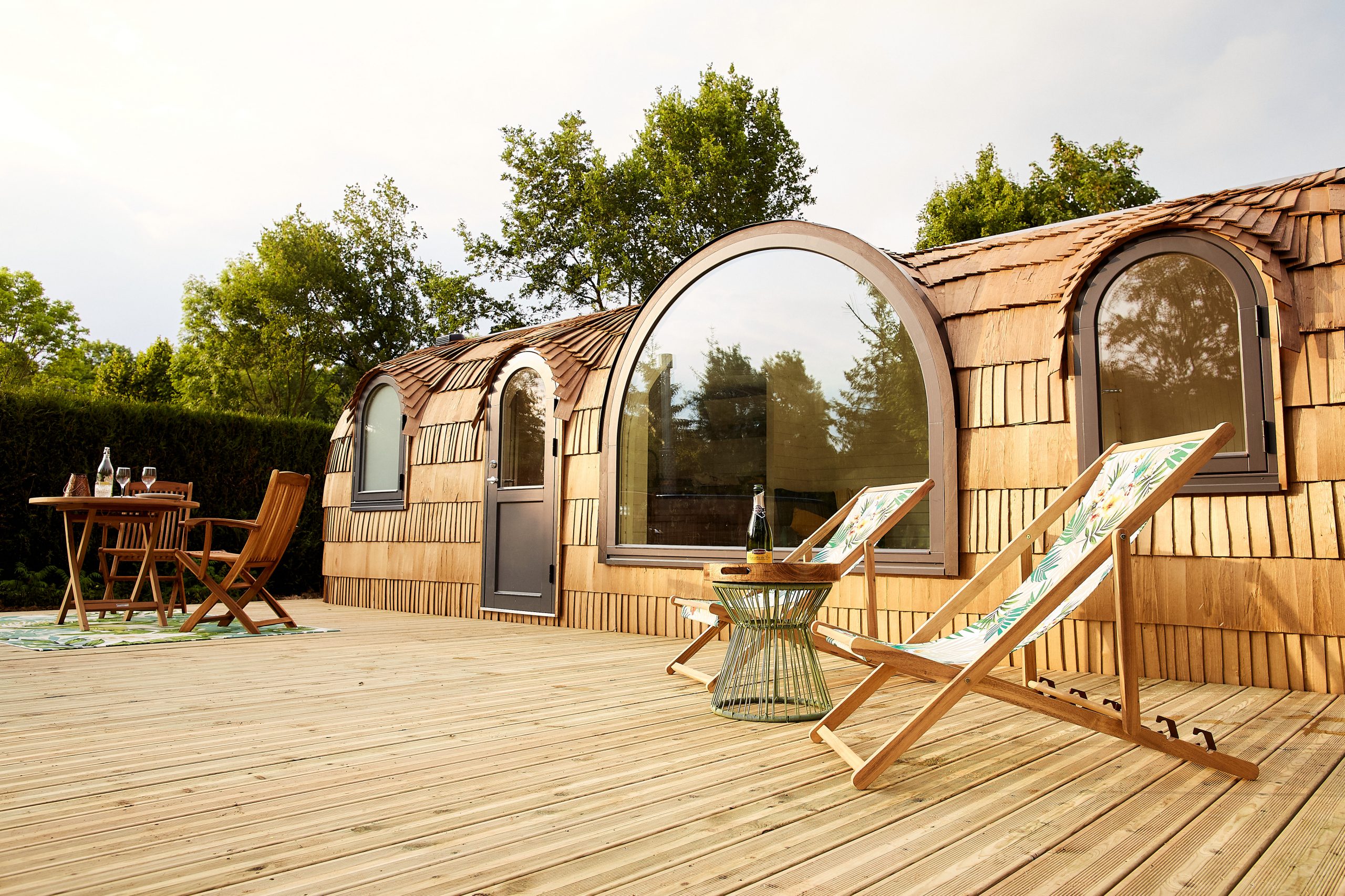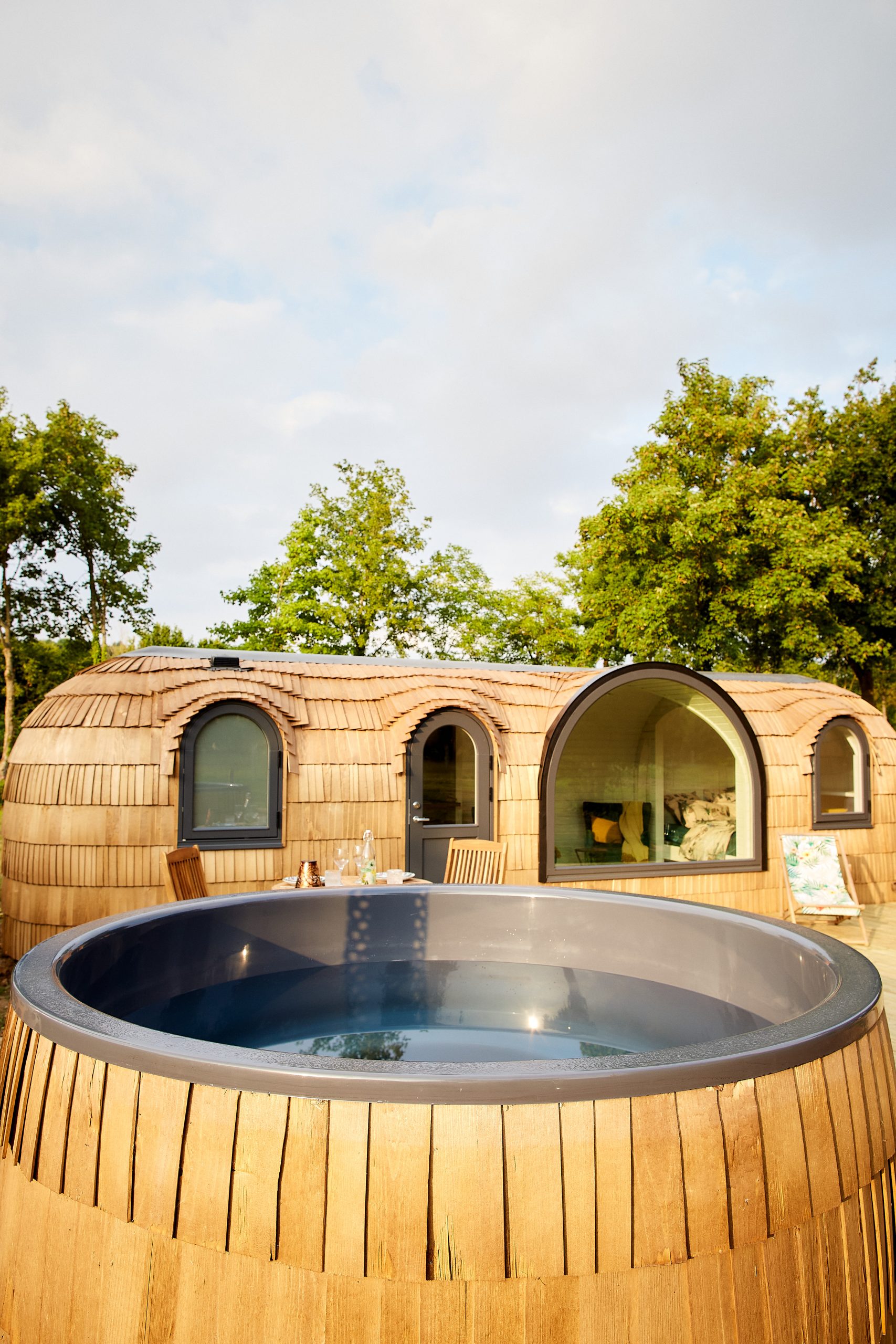 La Charmeuse est une cabane tout confort incluant un bain nordique et un sauna.